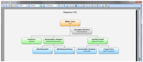 Organigramme / postes: gestion et visualisation d‘organigrammes, niveaux d’organisation à définir librement par l’utilisateur, description des postes et des compétences requises, présentations, fonctions et responsabilités des postes