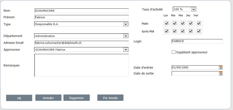 - saisie des timesheet par demi-journée (présences, vacances, maladies, déplacements etc.