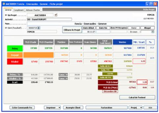 La Fiche Projet (Chantier), au cœur du système permet au chargé d’affaire de gérer et de suivre le projet de manière rapide et efficace. La Fiche consolide toutes les données du projet.  :