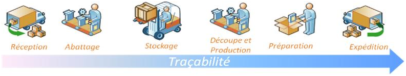 La traçabilité est au cœur du système. Tous les flux sont tracés, contrôlés et complétés à travers le numéro de lot et ces caractéristiques : (Espèce, Race, Catégorie, Variante Qualité, DLC, DLUO).